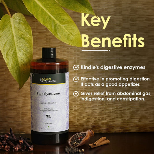 Pippalyasavam is a digestive stimulant. It kindles digestive enzymes, which are effective in promoting digestion. Ingredients - What Does It Contain? Pepper Long Pepper Wild Pepper Turmeric Leadwort Nut Grass False Pepper Adhathoda Ash Sheora Amla Sweet Cherry Vetiver Sandalwood Costus Clove Sickle Pod Musk Root Cinnamon Prickly Ash Cardamon Tejpathra Ironwood Tree Jaggery Fireflame Bush Grapes Benefits - What’s in It for You? Promotes effective digestion How To Use Take 30ml twice, daily after food. Manufactured & Marketed by Bipha Drug Laboratories Pvt Ltd B1-B4 Industrial Estate Ettumanoor Kottayam 686631 Kerala IndiaRegular price Rs. 690.00Regular priceUnit price perRs. 690.00Sale price Rs. 690.00 -