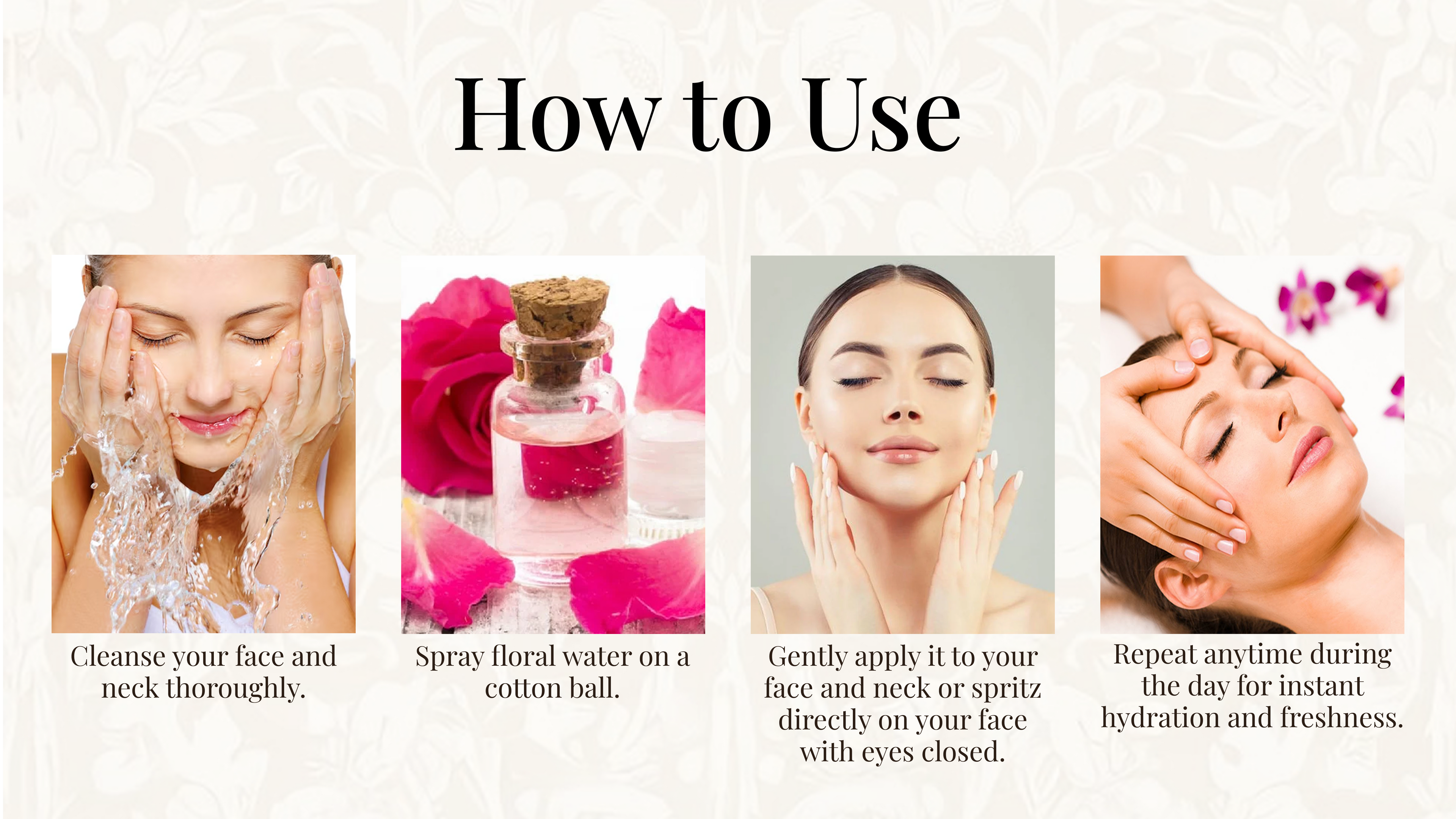 After cleansing, spray some floral water on a cotton ball and apply it to the face and neck to hydrate and perk up your skin. You could also close your eyes and spritz it straight onto your face as a facial mist. It can be used as often as required during the day.