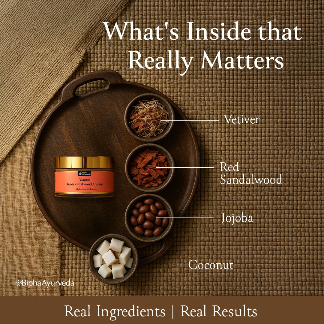 Yamini Redsandalwood Cream is a beauty balm that works magic on your scars, blemishes, under-eye darkness, and dark spots with regular use. This best ayurvedic night cream features red sandalwood, one of Ayurveda’s most precious botanicals with magical blemish-fighting properties, making it the ideal natural night cream for dark spots. Designed as an anti blemish night cream, it helps fade imperfections while you sleep.
