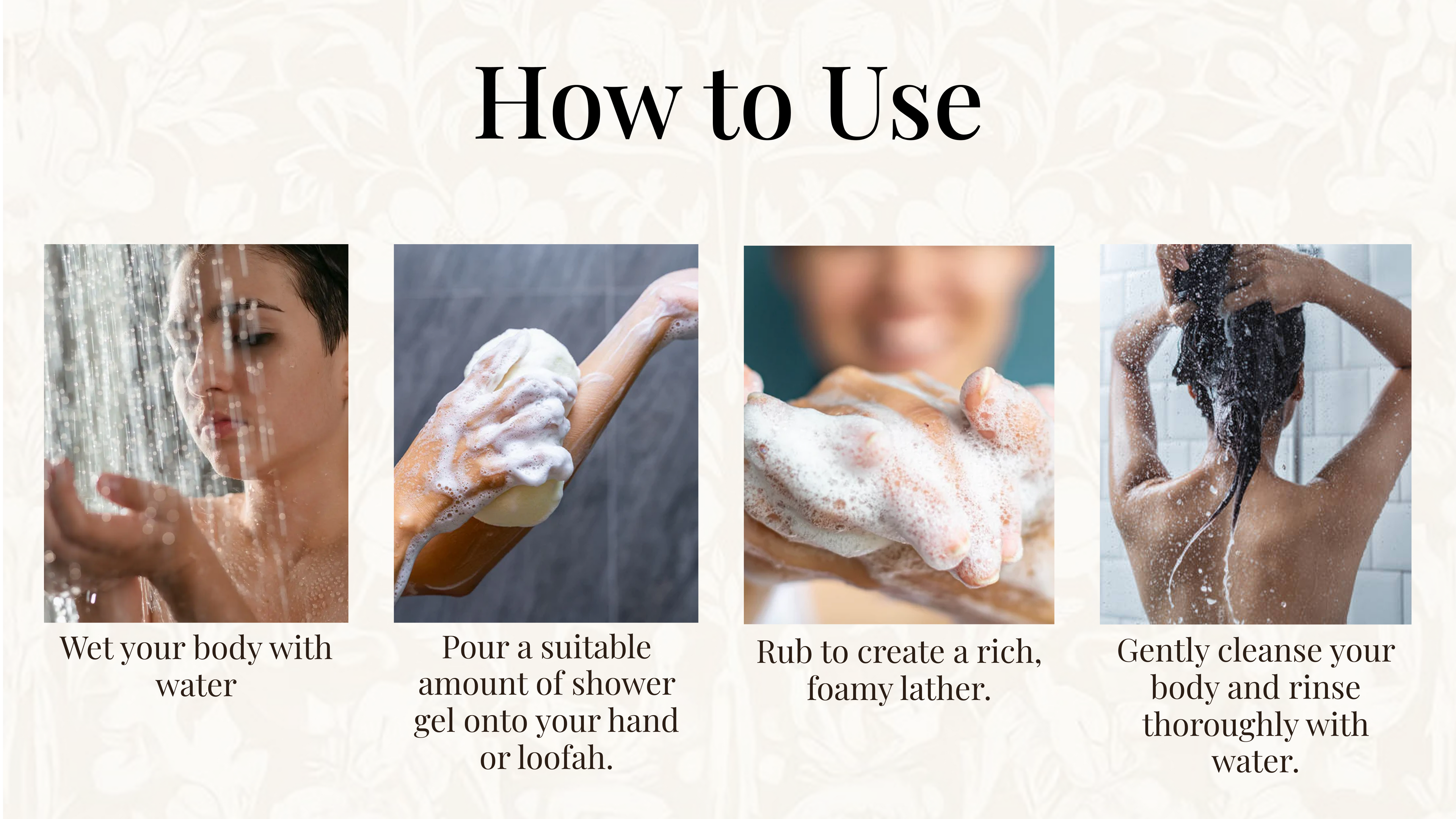 Wet your body and pour a suitable amount of shower gel into your hand or on a loofah and lather luxuriously.