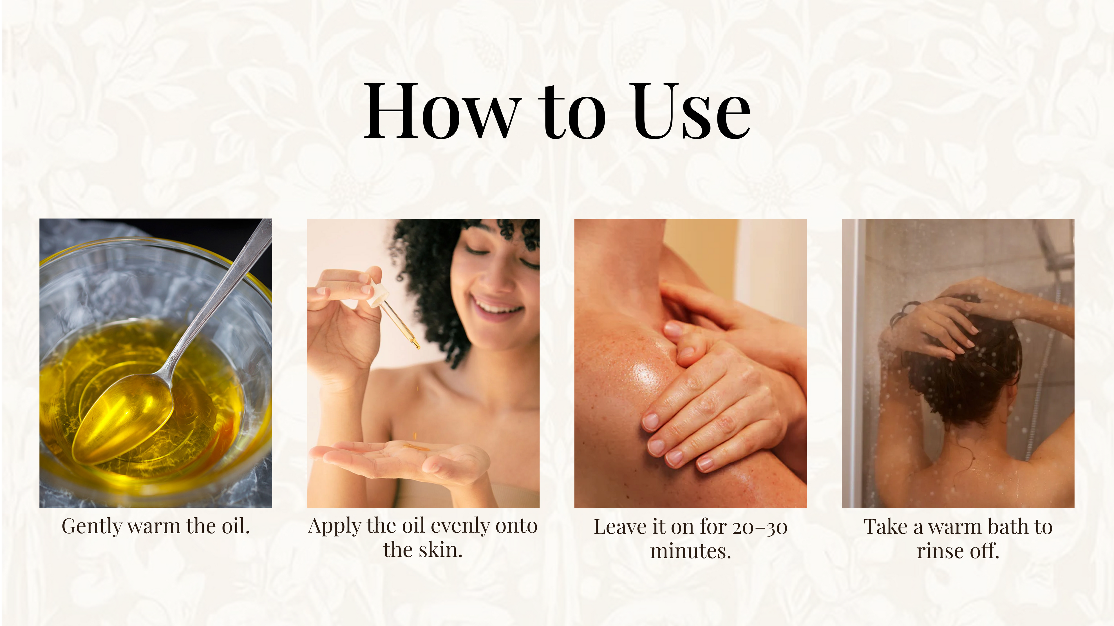 Warm the oil and apply it to the skin. Leave it on for 20 to 30 minutes. Have a warm bath.