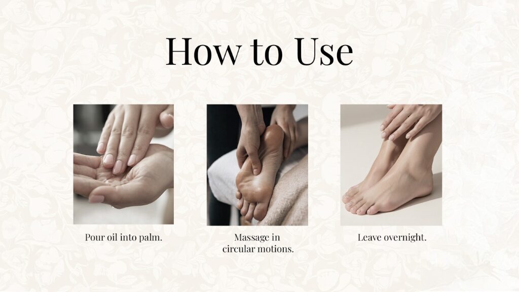 This Natural foot massage oil is packed with Essential oils for tired feet, making it a must-have Herbal massage oil for legs and feet after long, busy days. It’s celebrated as the Best oil for cracked heels, helping to soften tough skin while delivering instant Oil for foot pain relief. Whether you’re winding down after a workout, a work shift, or a full day on your feet, this luxurious blend will restore comfort, smoothness, and a fresh spring in your step.