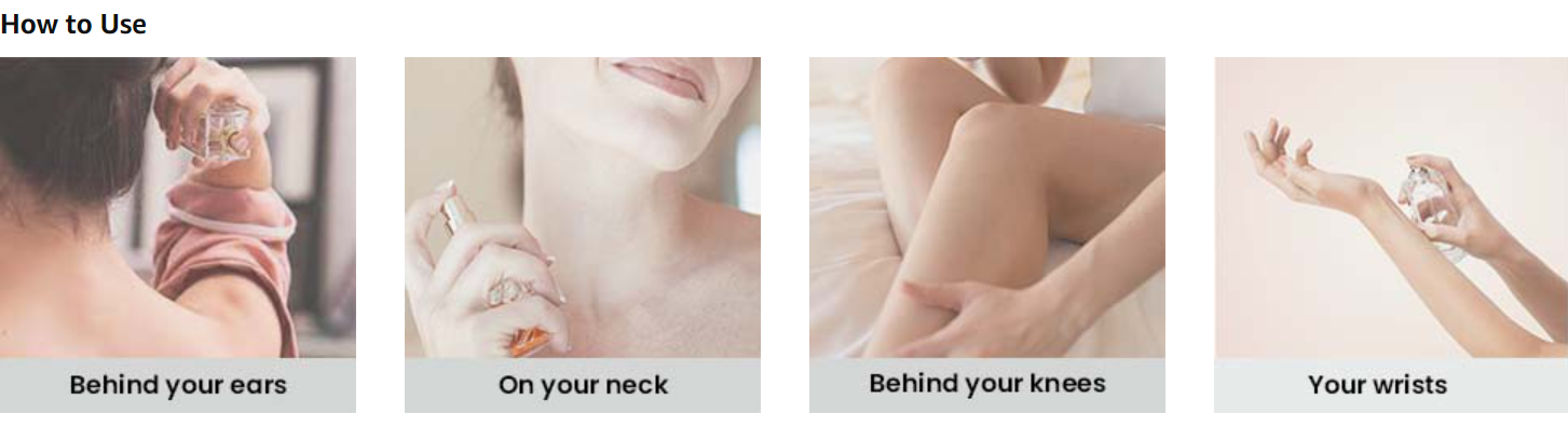 Dab the perfume on your pulse points which include the insides of the elbows, back of the knees, chest, and the sides of the neck to activate the fragrance throughout the day.