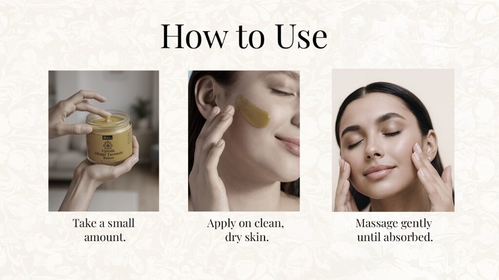 Give your skin the gift of nourishment with Ujjwala Alleppy Turmeric Butter, a rich turmeric body butter crafted with Ayurvedic care. Infused with Alleppey turmeric, this luxurious blend works as a moisturizing cream for glowing skin, leaving it soft, smooth, and radiant after every use.