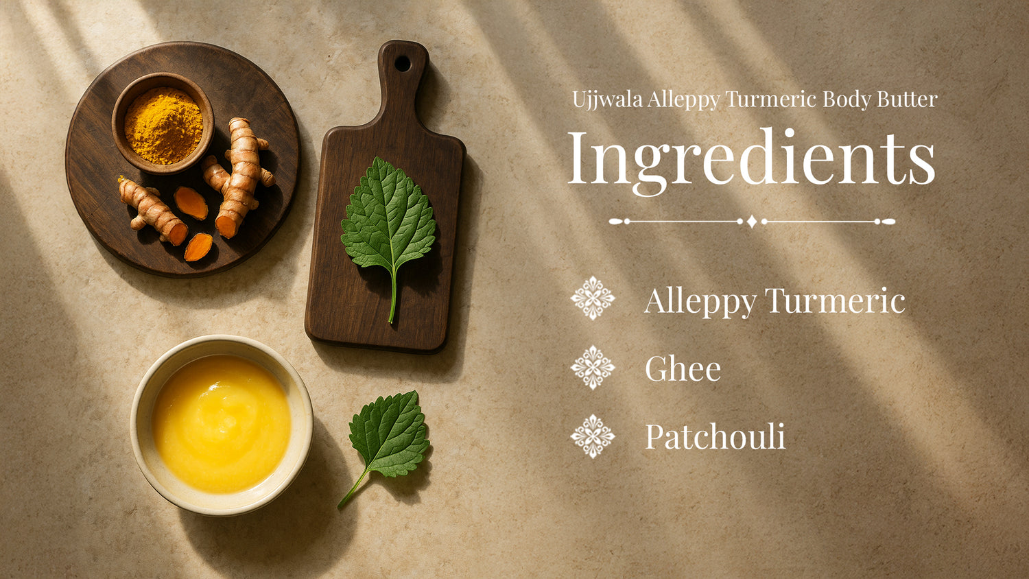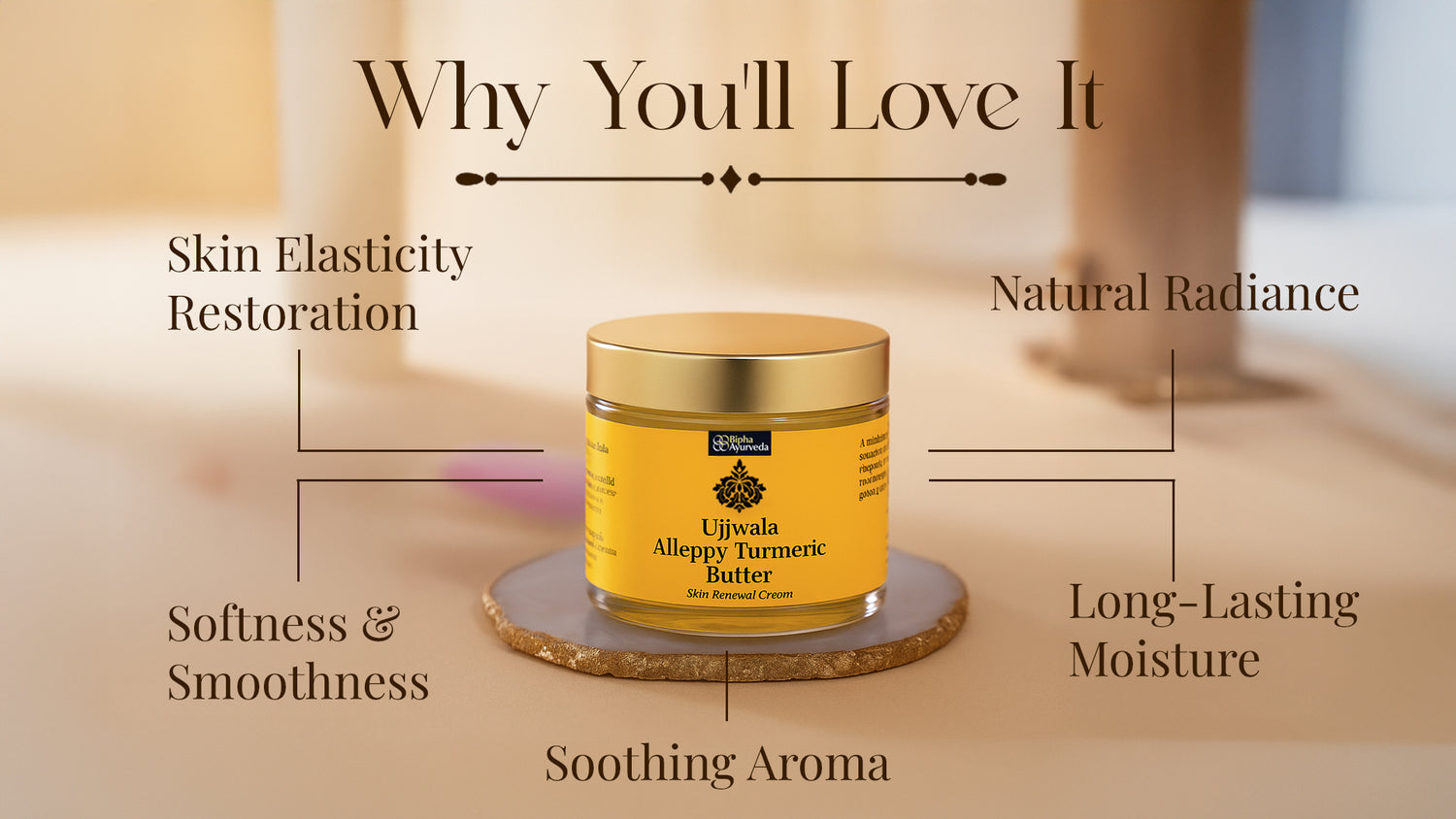 Give your skin the gift of nourishment with Ujjwala Alleppy Turmeric Butter, a rich turmeric body butter crafted with Ayurvedic care. Infused with Alleppey turmeric, this luxurious blend works as a moisturizing cream for glowing skin, leaving it soft, smooth, and radiant after every use.